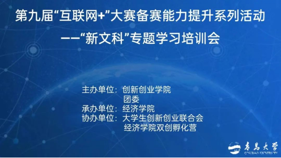 新闻网讯 近日,由beat365在线唯一官网创新创业学院和beat365在线唯一官网团委联合主办,经济学院承办的第九届“互联网+”大赛备赛能力提升系列活动——“新文科”专题学习培训会以线上方式举办,活动特邀国赛评委王承超主讲,由经济学院党委副书记于文洁主持。