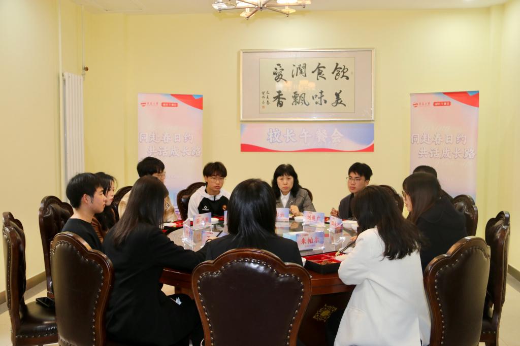 本次午餐会主题为“同赴春日约 共话成长路”,刘彩云与同学们边吃边聊、亲切交流,认真倾听他们对大学生活的体验和感受,询问他们对大学生活的规划和期待,征求他们对学校的意见和建议。同学们分别围绕专业学习、志愿服务、竞赛氛围、师资力量以及体育运动等方面分享了自己的大学生活体验,表达了大学生活的期待与憧憬,同时就当前存在的疑惑向校长进行了咨询。