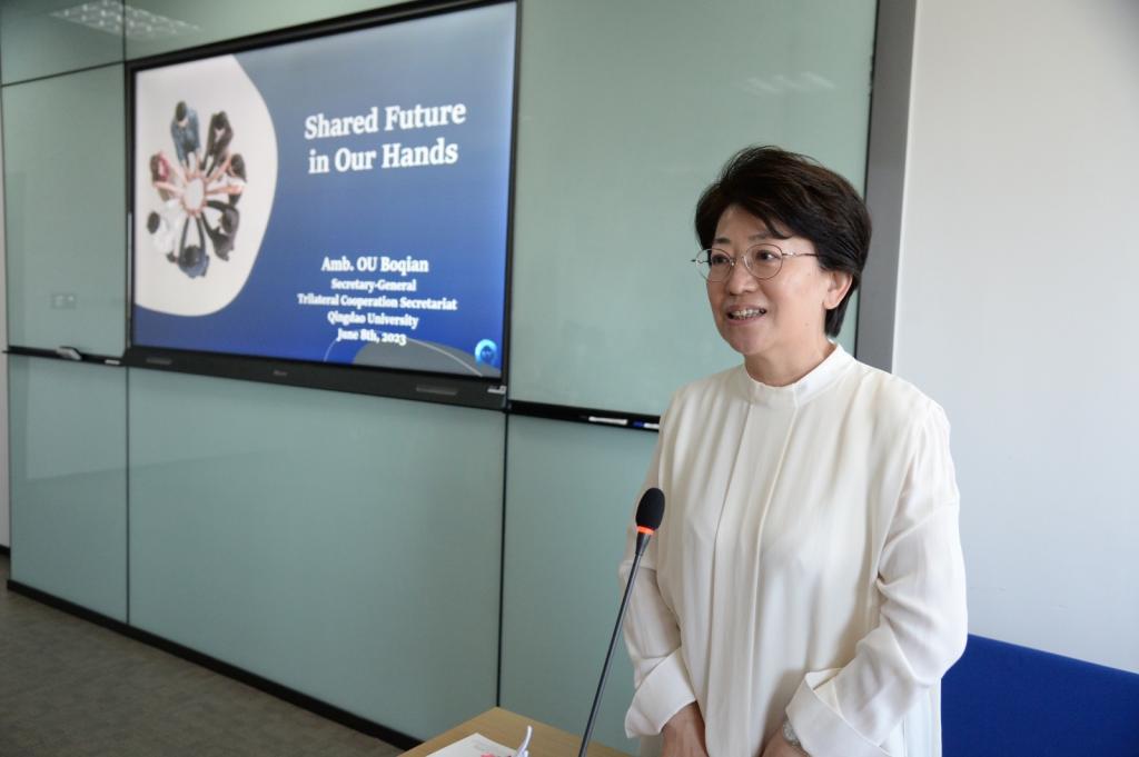 新闻网讯 6月8日下午,中日韩合作秘书处秘书长欧渤芊应邀来校做题为“新形势下的中日韩合作”学术报告。校党委常委、副校长刘彩云出席报告会。政治与公共管理学院党委书记隋晓玲、院长陈洪连以及学院60余名师生代表参加。报告由政治与公共管理学院副院长韩庆娜主持,