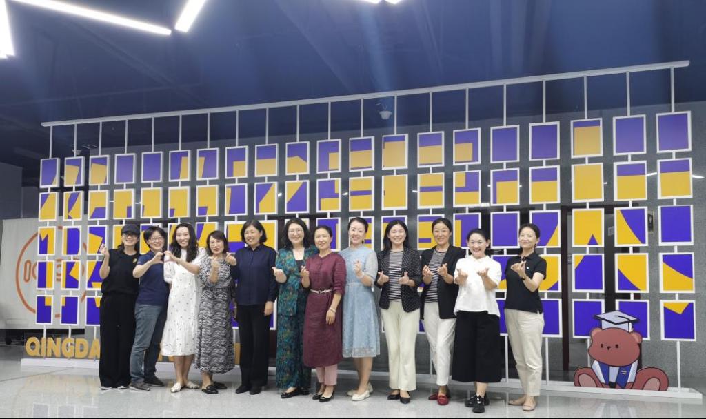 纺织服装学院教师初晓玲分享了指导学生创业的体验,与创业团队提前设计、搭建起作品展示区域,青大元素、创客标识、原创学位服、文创周边等,吸引大家纷纷驻足观看、合影留念。