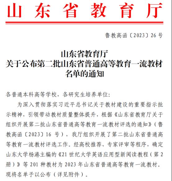 据悉第二批山东省普通高等教育一流教材共评出201种,其中本科生教材178种,研究生教材23种。