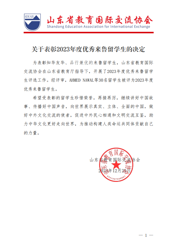 据悉,此次评选表彰活动是在山东省教育厅的指导下,由山东省教育国际交流协会评选表彰出的知华友华、积极投身中外文化交流、综合素质优良、全面发展的全省30名优秀来鲁留学生。