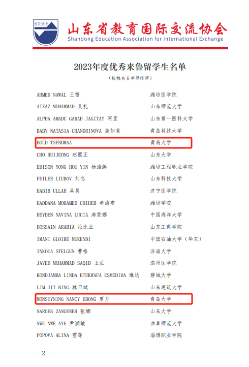 新闻网讯 近日,山东省教育国际交流协会发布了《关于表彰2023年度优秀来鲁留学生的决定》,beat365国际教育学院2020级赤道几内亚籍本科留学生覃月及公共卫生学院2020级蒙古国籍博士留学生BOLD TSENDMAA被评为2023年度优秀来鲁留学生。