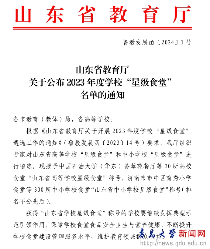 山东省教育厅为持续推进我省学校食堂规范化建设,提升学校食堂建设管理服务水平,继续发挥典型示范引领作用,决定组织开展 2023 年度山东省学校“星级食堂”遴选工作。此次评选,省教育厅组织专家在全省范围内共评选出30个山东省高等学校“星级食堂”,300个山东省中小学校“星级食堂”。