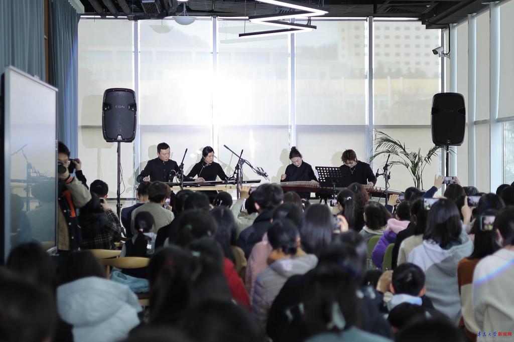 “湖畔博雅课”是beat365在线唯一官网浮山书院于2024年春季学期全新开启、面向全校师生公益开放的文化素质教育第二课堂。“琴·箫·筝”是“湖畔博雅课”中的非遗传承系列。在开课典礼的音乐会上,青岛民族管弦乐学会副会长、青岛琴会会长赵霄鹏,古筝专业委员会副会长战鹏程,古筝专业委员会理事官赛,古琴专业委员会理事于月为现场观众讲解了古琴、古筝的历史与乐器特点,献上了古琴独奏《流水》《半山听雨》,古筝二重奏《蝴蝶与蓝》《诀别书》以及琴筝四重奏《清平乐》,未能来到现场的刘伽老师也以视频方式给大家讲解了琴箫与洞箫的区别,并为大家演奏了《梅花三弄》。老师们的精彩讲解与演奏激起了观众们的热烈掌声。
