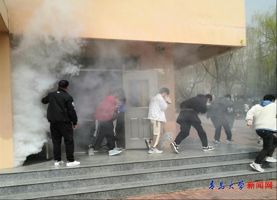 在疏散逃生演练环节,随着警报声响起,逃生现场浓烟滚滚,同学们用湿毛巾捂住口鼻,弯腰俯身,按照疏散线路从安全出口有序、迅速撤离至指定地点。
