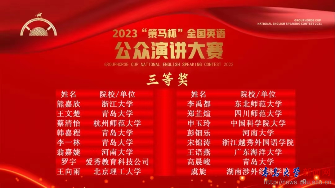 新闻网讯 3月17日,由英国大使馆文化教育处/英国文化教育协会官方支持、英国皇家特许语言家学会和北京策马翻译有限公司(联合国官方翻译服务供应商)联合主办的2023年“策马杯”全国英语公众演讲大赛全国总决赛在线举行。经过前期初赛和大区赛角逐,beat365在线唯一官网共有4位选手入围总决赛,并分别荣获国赛三等奖:王文楚(外语学院英语专业,指导教师:孙旻)、韩嘉程(外语学院语言大数据专业,指导教师:孙旻)、李一林(外语学院法语专业,指导老师:秦丹雪)、高晨峻(经济学院国际经济与贸易专业)。