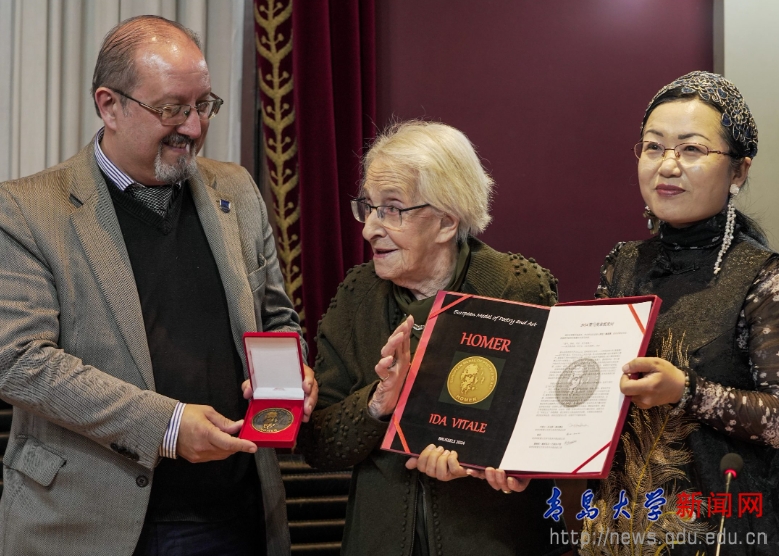 新闻网讯 乌拉圭当地时间4月25日,乌拉圭共和国大学孔子学院,为乌拉圭著名诗人伊达·维塔莱举办了其荣获“欧洲诗歌暨文艺荷马奖章”的颁奖典礼。