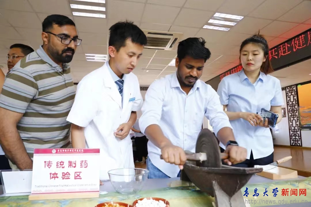 在活动现场,医护人员现场展示了中医养生运动项目八段锦和五禽戏,并诵读了中医经典《大医精诚》。在八段锦和五禽戏的教学环节,国际学生在医护人员的指导下,一招一式认真学习。随后留学生先后学习体验了拔罐、推拿、刮痧、耳穴压豆、火龙罐、棍针、艾灸、中药材鉴别等中医药项目,并品尝了具有养生保健功效的中药特色茶饮,亲手制作了中药香囊。留学生们对中医独特的治疗方法十分感兴趣,踊跃参与其中,在沉浸式体验中感受到了中医文化的神奇和精妙。