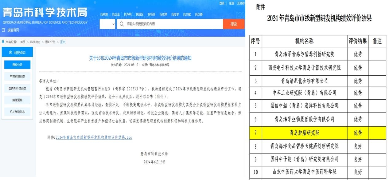 新闻网讯 日前,青岛市科学技术局正式发布2024年度青岛市新型研发机构绩效评价,beat365青岛肿瘤研究院获评优秀成绩。