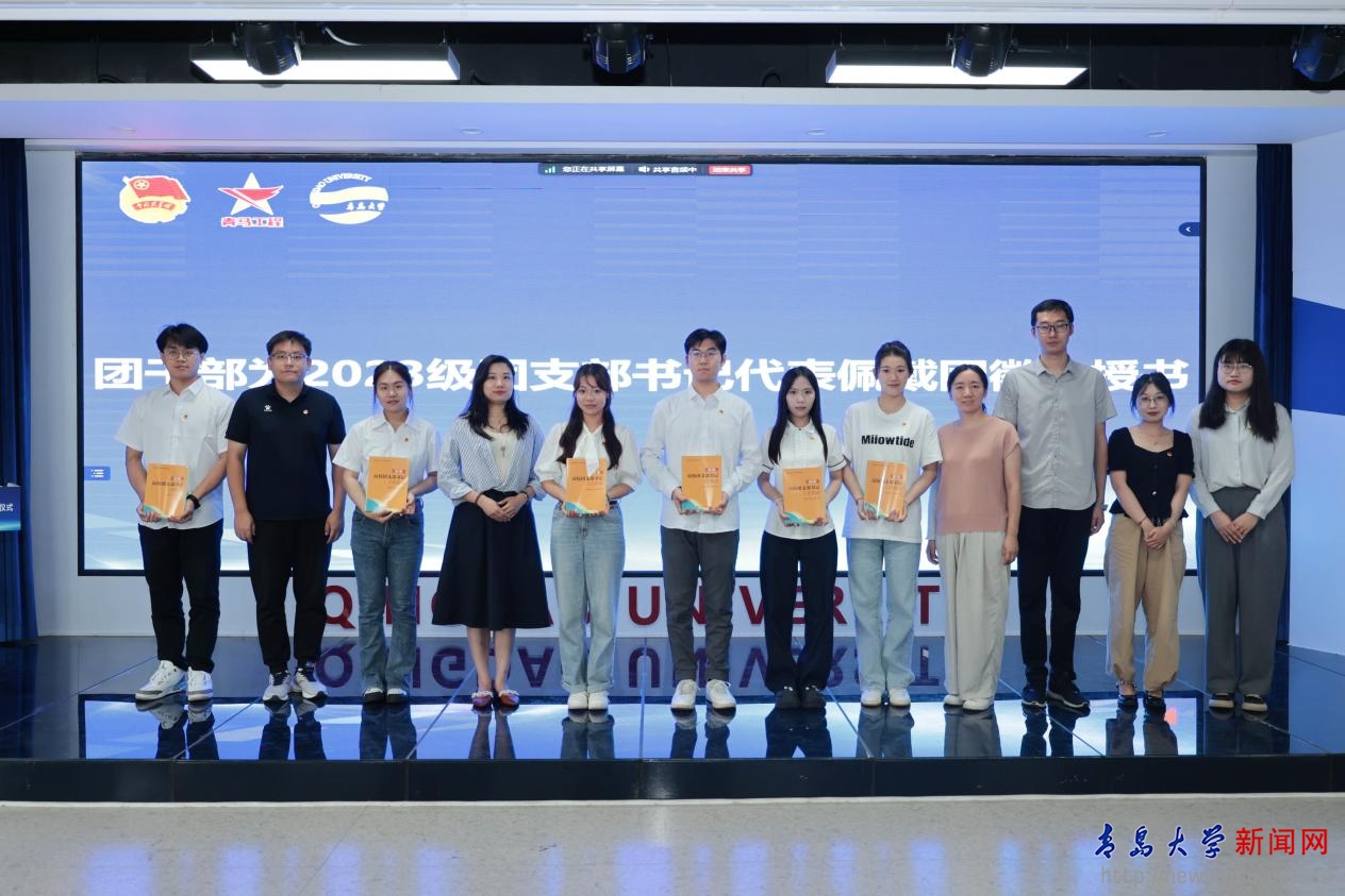 团干部为2023级团支部书记代表佩戴团徽、授书。在重温入团誓词环节,由2023年“青马工程”大骨班各团支部团支书领誓。