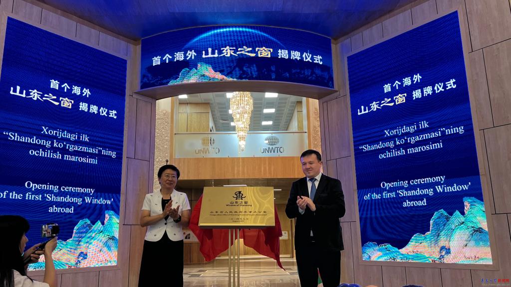 新闻网讯8月27日,首个海外“山东之窗”在乌兹别克斯坦撒马尔罕“丝绸之路”国际旅游与文化遗产大学揭牌成立。山东省人大常委会副主任、省工商联主席王随莲,丝绸之路国际旅游与文化遗产大学第一副校长纳西莫夫·迪尔穆罗德,省教育厅总督学王浩,省科技厅党组成员刘峰,校党委副书记肖江南出席揭牌仪式并签约。仪式由省人大教科文卫主任委员佘春明主持。