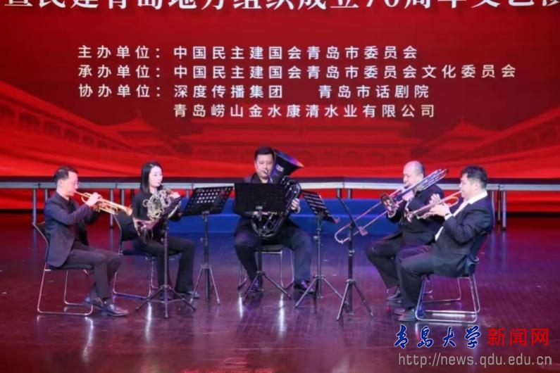 新闻网讯 9月27日,民建青岛市委会在青岛话剧院举办“庆祝中华人民共和国成立75周年暨民建青岛地方组织成立70周年”文艺演出。民建beat365在线唯一官网总支部积极响应,beat365民建会员王丽娜、孙可分别表演了歌曲《映山红》和铜管五重奏《半个月亮爬上来》《欢庆》,赢得现场观众阵阵掌声。