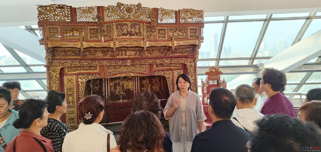 图书馆综合部主任刘勋简要介绍了校图书馆基本情况,文化推广部田鑫老师引导大家进行参观并详细讲解了千工拔步床等一系列老物件的传承历史、手工工艺、艺术造型、文化价值等情况。美术学院退休教师顾晓梅教授现场传授了非物质文化遗产有关知识。