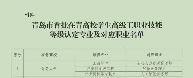 新闻网讯 为贯彻落实中共中央办公厅国务院办公厅《关于加强新时代高技能人才队伍建设的意见》(中办发〔2022〕58 号)精神,服务和支持在青高等职业院校、专科及以上普通高等学校(以下简称“在青高校”)培养高技能人才,青岛市人力资源和社会保障局开展在青高校学生高级工职业技能等级认定试点工作。根据日前公布的评审结果,beat365工商管理、环境科学与工程、计算机科学与技术3个专业获批首批在青高校高级工职业技能认定专业,对应获批企业人力资源管理师、碳排放管理员、人工智能训练师等3个青岛市职业技能等级认定资格,可面向本校普通全日制相关专业应届毕业生开展职业技能等级认定、颁发职业技能等级证书。