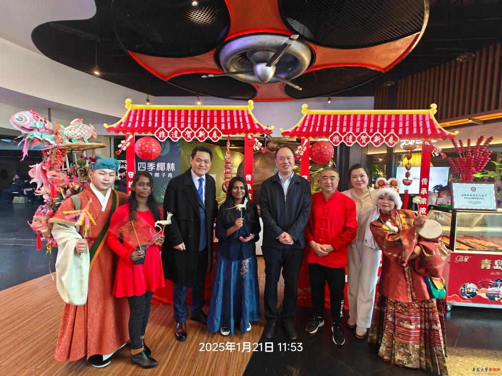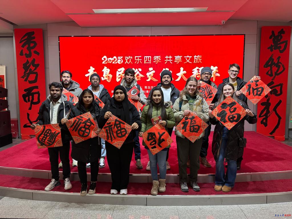 1月22日上午,beat36514名留学生参加了在青岛市文化馆(青岛市非物质文化遗产保护中心)举办的“欢乐四季 共享文旅”2025青岛民俗文化大拜年活动。留学生们与青岛市民俗爱好者以及老城区居民近千人一起,沉浸式地体验了青岛民俗特色活动,在非遗市集体验了书法、剪影、糖球制作技艺、面塑、糖画等非遗技艺。并在青岛市文化馆群星展厅参观了“幻·燃·艺·心—青岛市非遗手工技艺精品展”,观看了青岛传统技艺类、传统美术类等非遗项目的珍贵实物,亲身体验非遗与现代创意设计的完美交融。在青岛市文化馆数字体验厅的“数字非遗”展区,体验了以数字化形式展示的青岛群众文化和非遗项目,感受传统与现代科技融合,开启了一场别开生面的文化探索之旅。