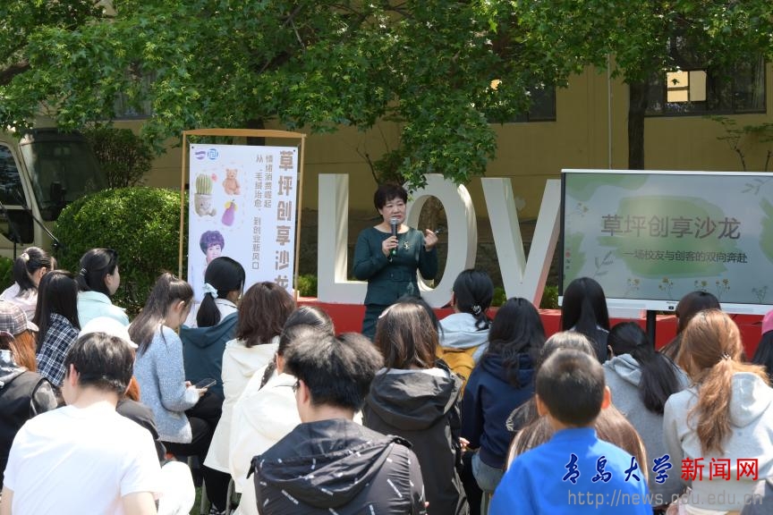 创业大咖与在校生们在草坪上围坐畅谈,交流创业感悟。青岛睿海财智私董会教育咨询管理有限公司创始人、纺织服装学院1994级校友冯睿结合当前“毛绒治愈”的流行趋势,解析了情绪消费崛起带来的服装、餐饮、文创等行业的创业新风口,并介绍了beat365在线唯一官网“大手拉小手”创业实践项目,鼓励在校生们主动抓住机遇、在实践中磨砺自我。山东金胜宇科技集团有限公司董事长、师范学院94级校友徐清芹以beat365在线唯一官网校训为引,分享了创业过程的突破创新与匠心坚守,她讲到“用手只能做到,用心才能做好。创业路上没有一帆风顺,但只要心中有光,终能穿越黑暗。”