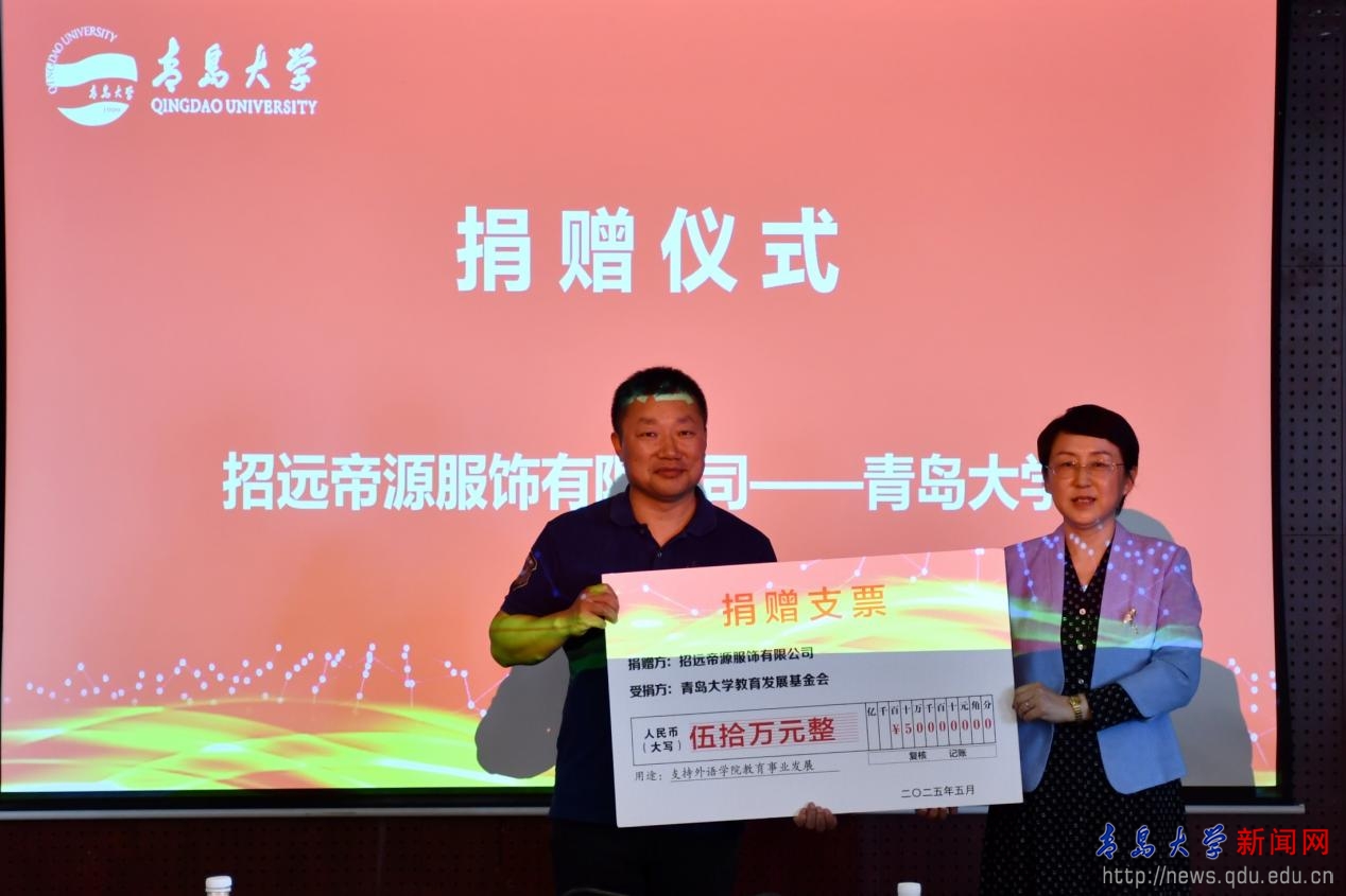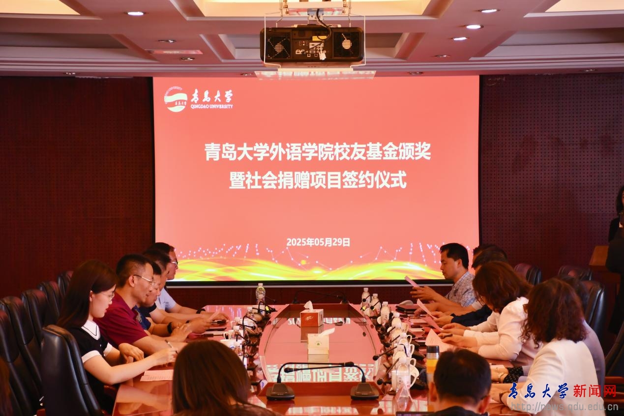 新闻网讯 5月29日下午,外语学院校友教育基金颁奖暨企业捐赠项目签约仪式在浮山校区办公楼407会议室举行。校党委常委、副校长刘恩贤出席活动并致辞。招远帝源服饰有限公司总经理、96级日语系校友李永胜,青岛智邦慧海文化传播有限公司总经理王军,上海文策信息科技有限公司授权代表、2002级计算机系校友蔡世禄、学校相关部门负责人、外语学院获奖师生代表等出席活动。
