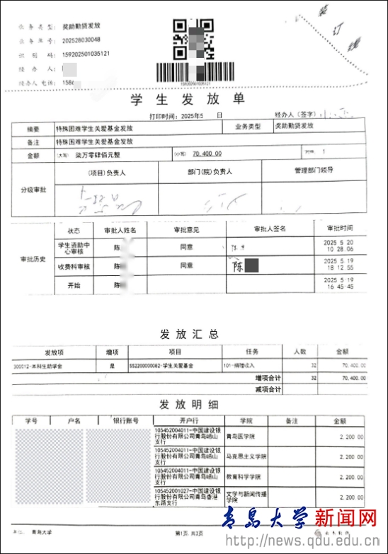 为了科学、规范、有效使用此笔关爱基金,充分发挥经济资助和育人实效,助推家庭经济困难学生成长成才,教育发展基金会会同学生工作处经过学生申请、学院初审、学校审核等流程,于六月初遴选出32名特殊困难学生,向每名学生发放关爱基金2200元,共计发放关爱基金70400元。截至目前,学校已经将此笔善款一次性发放至获资助学生个人账户。