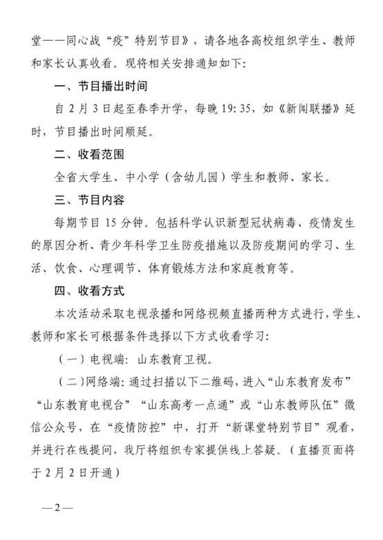 根据《省委办公厅省政府办公厅关于进一步加强新型冠状病毒感染的肺炎疫情防控工作的通知》精神和《山东省教育厅新型冠状病毒感染的肺炎疫情防控工作小组关于组织收看疫情防控特别节目的通知》(鲁教疫控组字[2020]5号)要求,为加强卫生健康教育,引导广大师生、家长提高健康素养,养成良好生活习惯,坚决打赢疫情防控阻击战,山东省教育厅委托山东教育电视台策划制作了《新课堂--同心战“疫”特别节目》,请各学院(部)组织学生、学工人员和家长认真收看。现将相关安排通知如下: