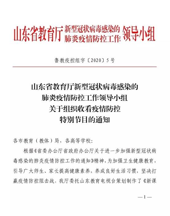 附:《山东省教育厅新型冠状病毒感染的肺炎疫情防控工作小组关于组织收看疫情防控特别节目的通知》(鲁教疫控组字[2020]5号)文件