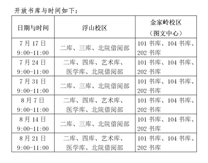 本科生所借图书可延期至2019年9月21日之前还回(教工和研究生读者除外)。暑期期间,中心校区图书馆、金家岭校区图文中心自习室正常开放,开放时间:早7:00——晚22:00。
